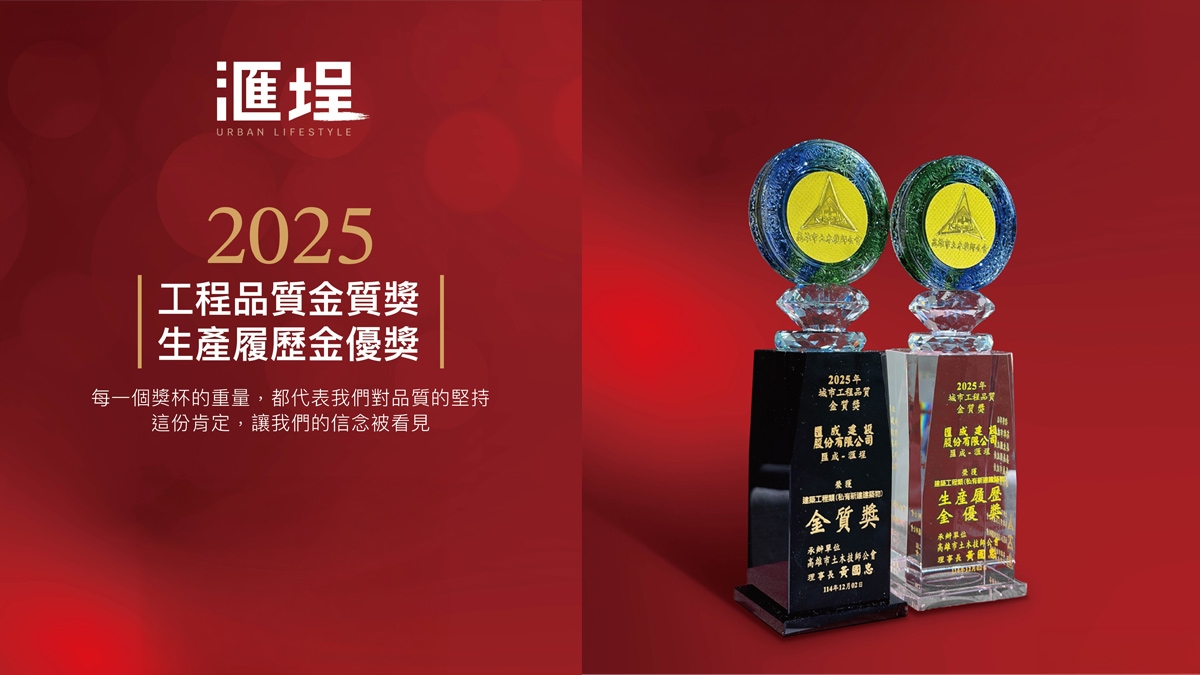 匯成建設始終站在住戶的角度思考,深知一棟好的建築,根基在於看不見的施工細節。在 2025 年度的建築盛事中,旗下建案「滙埕」憑藉卓越的施工品質與嚴謹的透明化管理,一舉拿下「城市工程品質獎 — 金質獎」與「生產履歷 — 金優獎」兩項最高榮譽。這兩座金級獎盃,是評審對匯成建築團隊專業實力的最高肯定。